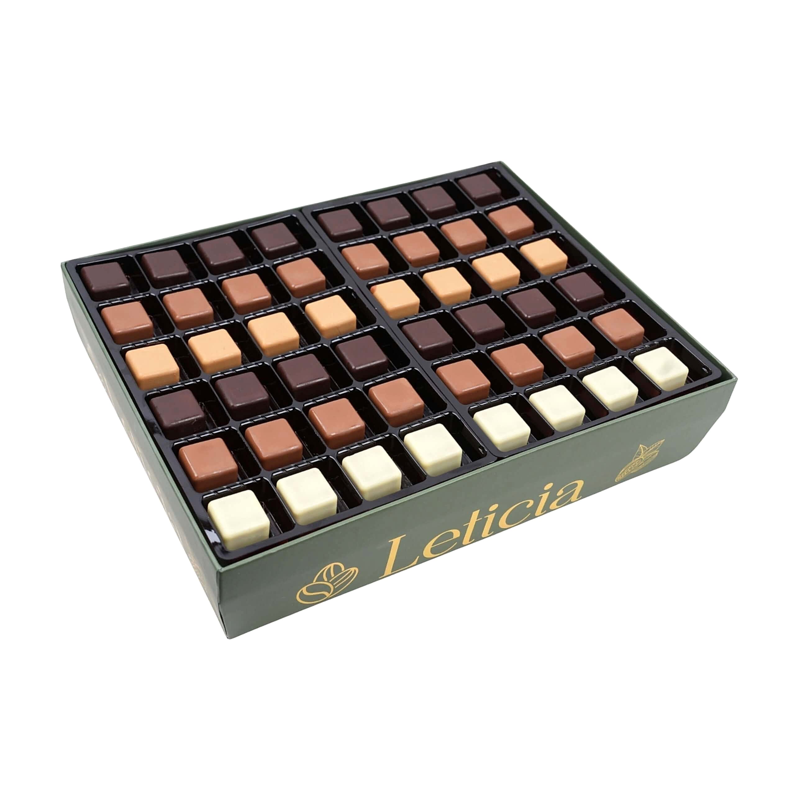 Leticia’nın yeşil-gold tasarımlı kutusu, ürünü yalnızca bir çikolata kutusu değil; aynı zamanda estetik bir hediye ve deneyim ürünü haline getirir. Minimalist dizilim, profesyonel çikolata kartelası görünümüyle marka kimliğiyle tam uyumludur.